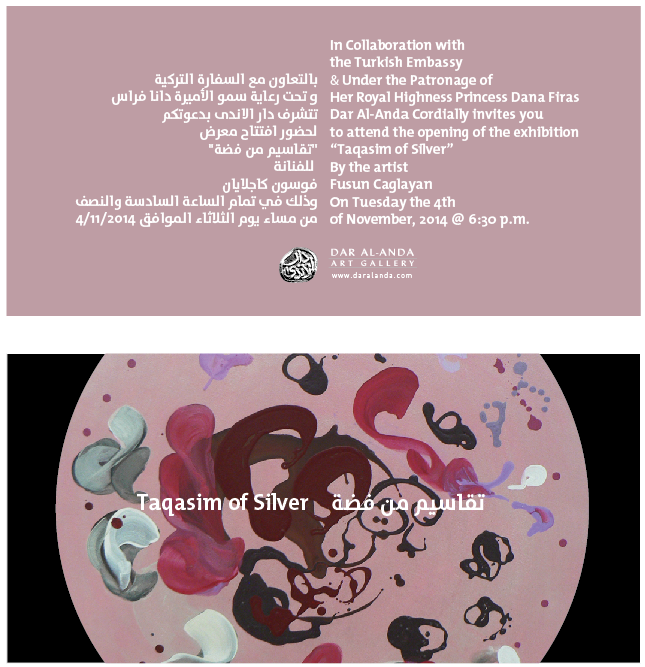 In Collaraboration with the Turkish Embassy and Under the Patronage of Her Highness Princess Dana Firas, Dar Al-Anda cordially invites you to attend the opening of the exhibition ”Taqasim of Silver” By the Artist Fusun Caglayan On Tuesday the 4th of November, 2014 at 6.30p.m.
