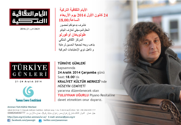 24 Aralık Çarşamba günü saat 18.00’da Kraliyet Kültür Merkezi’nde Hüseyin Cemiyeti yararına Tuluyhan Uğurlu piyano konseri gerçekleştirilecektir. (biletler konser öncesi kapıda satılacaktır, tam bilet ücreti 10 JD, öğrenci bileti 5 JD’dir) (Ek-4)