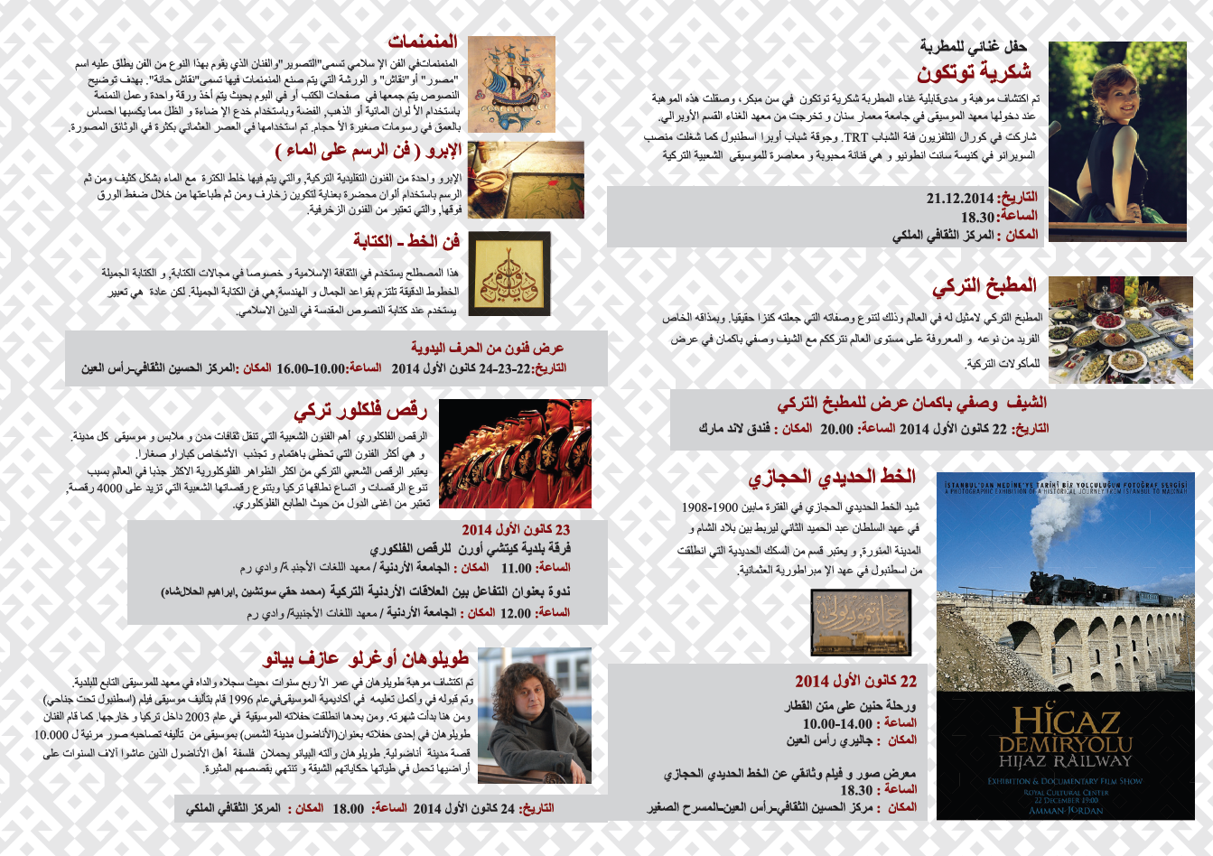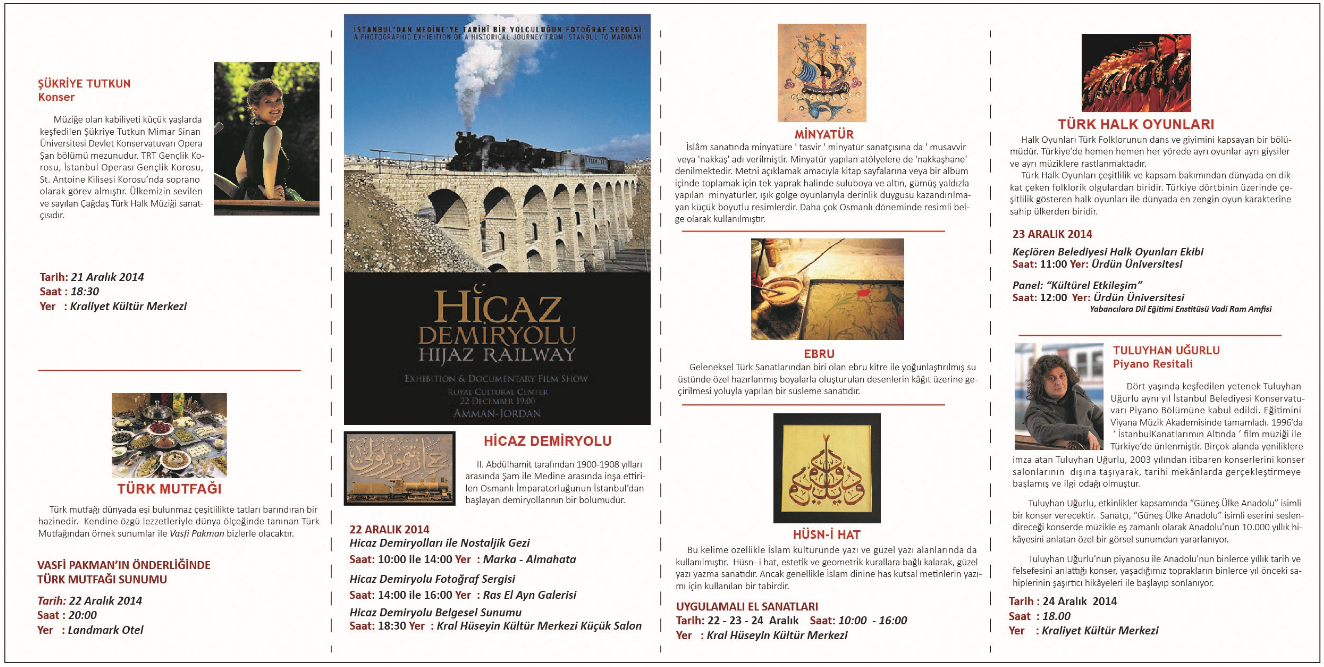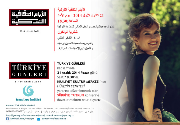 Türkiye Günleri kapsamında, 21 Aralık Pazar günü saat 18.30’da Kraliyet Kültür Merkezi’nde Hüseyin Cemiyeti yararına Şükriye Tutkun konseri düzenlenecektir. (biletler konser öncesi kapıda satılacaktır, tam bilet ücreti 10 JD, öğrenci bileti 5 JD’dir) (Ek-3)