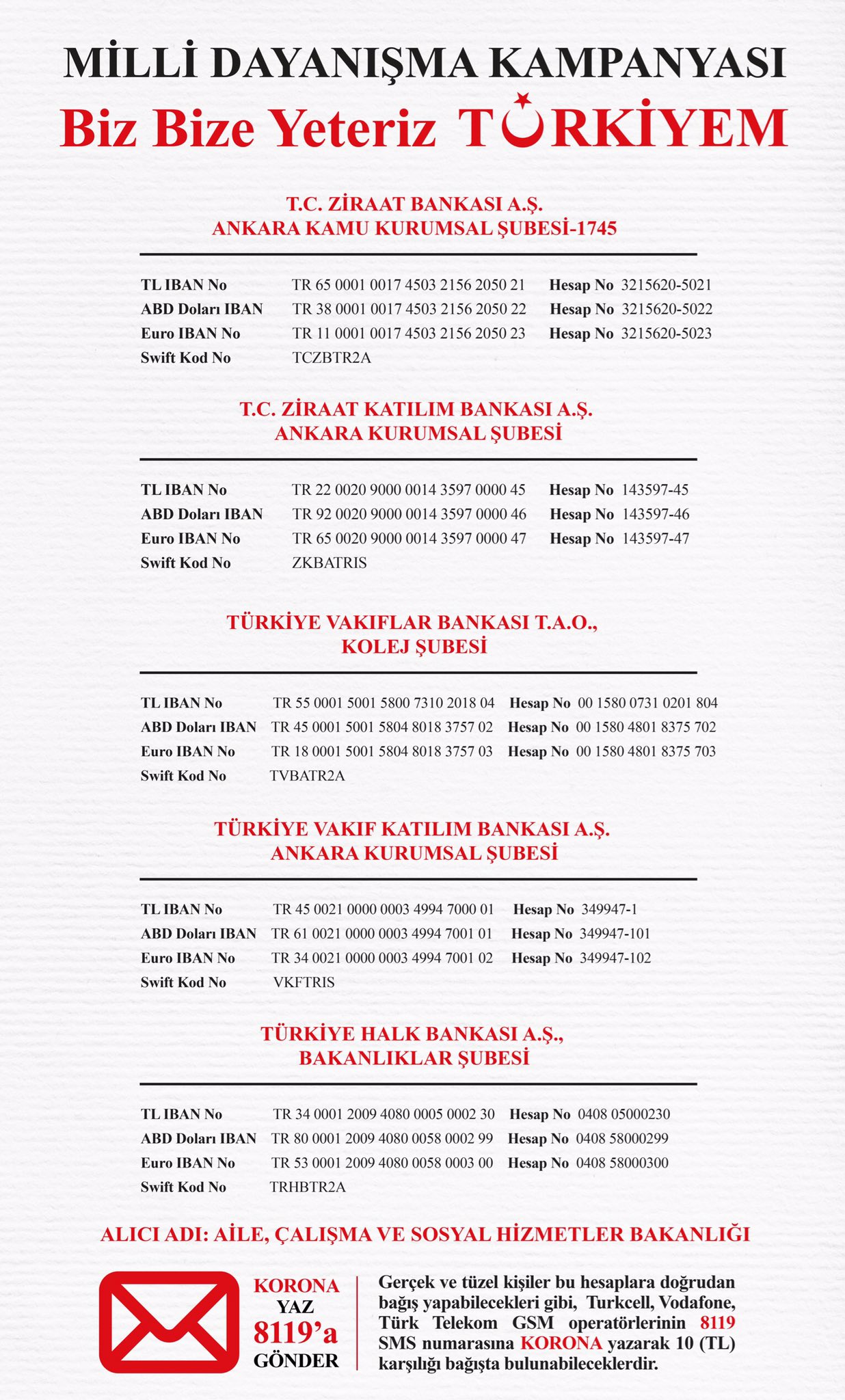 COVID-19 salgını nedeniyle başlatılan "Biz Bize Yeteriz Türkiyem" isimli Milli Dayanışma Kampanyası çerçevesinde vatandaşlarımızın bağışta bulunabilecekleri banka hesap bilgileri ekte sunulmaktadır.