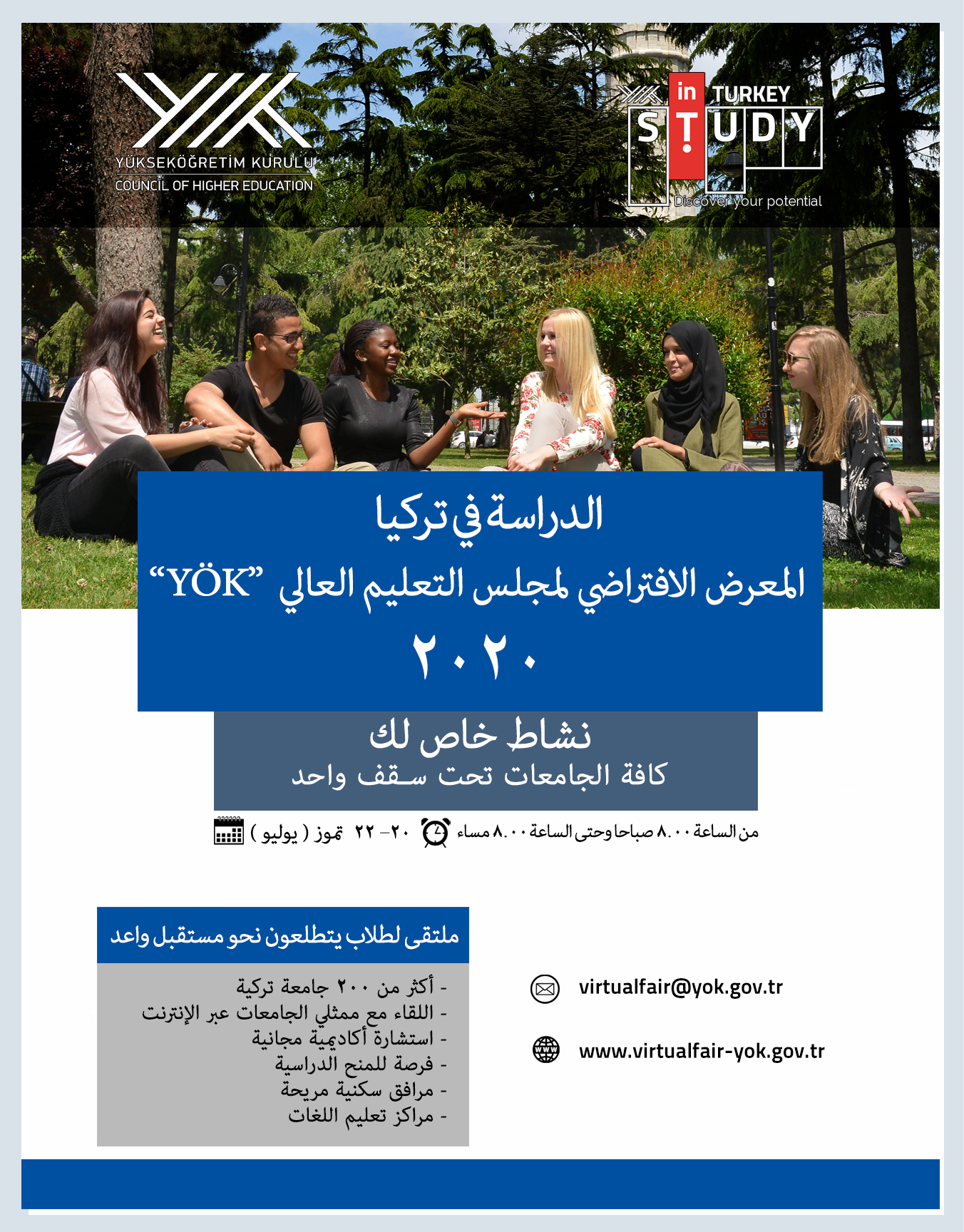20-22 Temmuz 2020 tarihlerinde küresel ölçekte düzenlenecek olan Study in Turkey YÖK Sanal Fuarı 2020, https://www.virtualfair-yok.gov.tr/ web adresi üzerinden gerçekleştirilecektir.